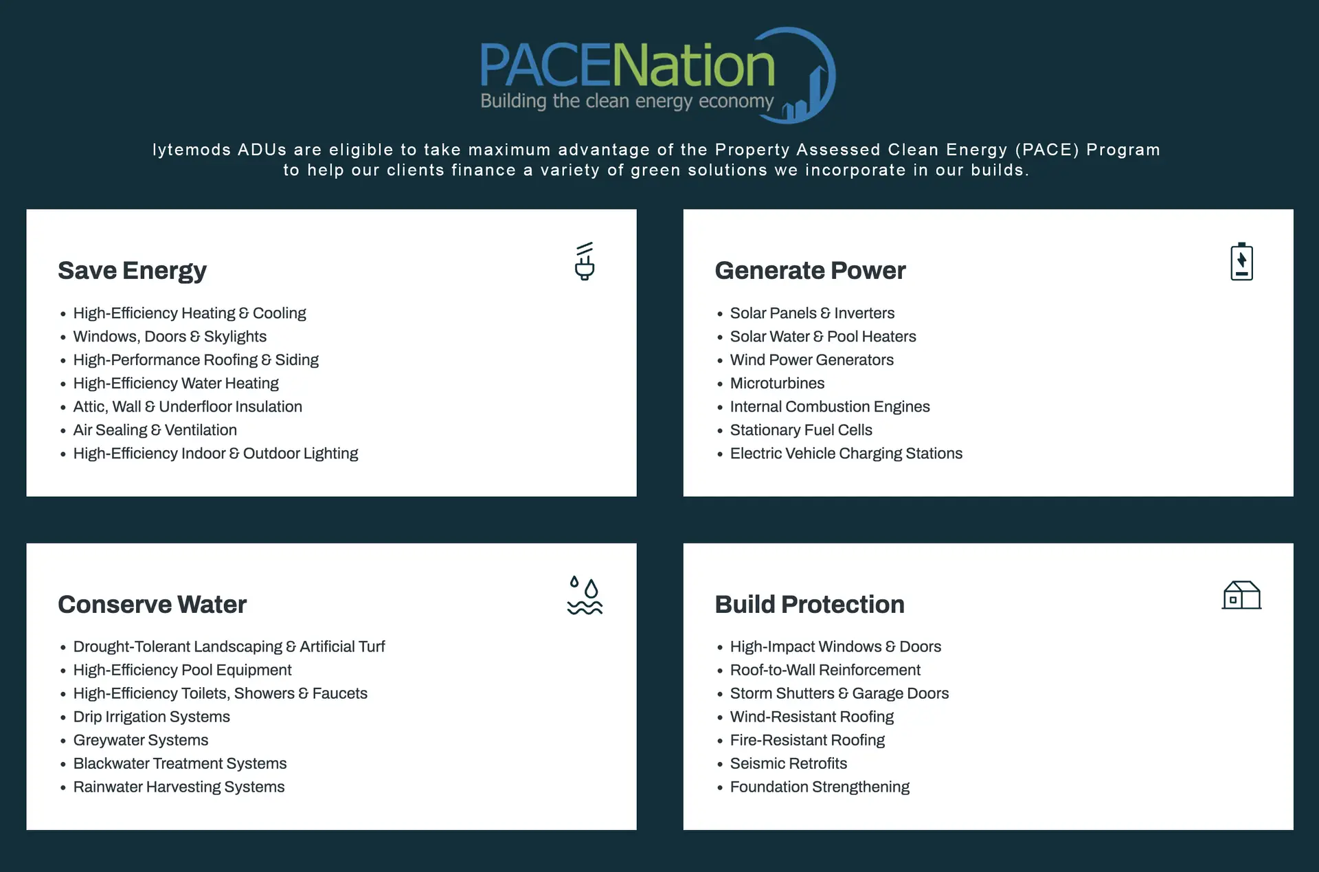 Because lytemods ADUs are built from top to bottom incorporating green solutions at every turn. Our clients are eligible to take maximum advantage of the Property Assessed Clean Energy (PACE) program to help finance a variety of energy efficiency and renewable energy improvements incorporated in the build of your lytemods ADU.